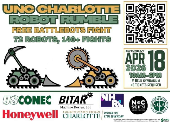 UNC Charlotte Robot Rumble – Sat, Apr 18, 2026 , 10:00am-6:00pm April 15, 2026 Miles Ruder FacebookTwitterPinterestLinkedin