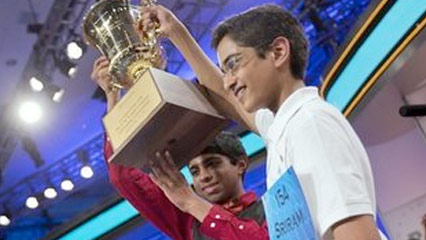 When the confetti flew, the two boys stood in the center of the stage and shook hands. They held up the trophy together. Both were champions, a Spelling Bee finish unseen in more than half a century.
