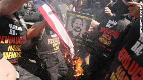 Cleveland police on Wednesday made 18 arrests and reported that two officers had been assaulted after a protester attempted to light an American flag on fire outside the security barrier surrounding the Republican National Convention, authorities said.